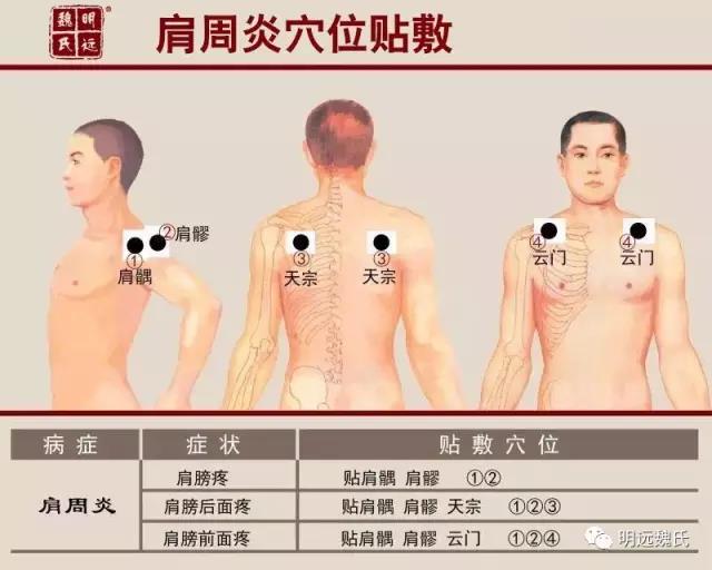 通过贴敷肩髃穴(主治:肩臂痉挛、上肢不遂),肩髎穴(臂痛、肩重不能举、胁肋疼痛),天宗穴(气喘、肩胛疼痛、肩背部损伤等局部病症),云门穴(气喘、胸痛、肩关节内侧痛、肩关节周围炎)经穴位组合贴敷,使药物有效成分迅速渗透到病灶部位,提高骨细胞的新陈代谢功能,减轻消除症状,恢复正常的生活水平,达到标本兼治的目的!