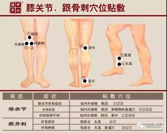 通过顶穴位的组合贴敷【鹤顶穴:通利关节、祛风除湿、活络止痛。膝眼穴:活血通络、舒利关节。委中穴:驱寒除湿、正腰除弊。复溜穴:补肾益阴、温阳利水】,使药物的有效成分川芎(行气活血、消融骨刺),皂角刺(消肿排毒、营养关节)没药(祛风散寒,续骨断筋)等,透皮、透骨、透髓吸收,直达病灶,克服了关节是无血管组织口服药不易吸收,理疗效果反复,手术风险大等弊端,打通经络,消除关节腔水肿,粘连和炎症,营养修复软骨、半月板、骨膜等组织,软化钝化骨刺,减轻消除症状,恢复正常的生活水平,达到标本兼治的目的!